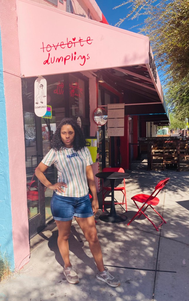 After our library visit we decided to stride through the lively downtown streets looking for a good snack. We came across a creative and charming restaurant named Lovebite Dumplings serving pork, chicken and veggie dumplings with your choice of noodles or rice – the food was delicious and packed with flavor. I decided to take a picture in front of the restaurant because I thought it to be nice looking.